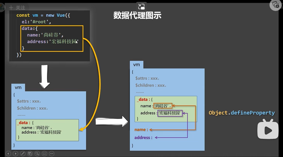 2、vm身上被添加name,address属性,只要有人读取name和address,就会通过Object.defineProperty里面的getter读取,只要有人修改vm.name,就会调用Object.defineProperty里面的setter使得vm._data.name也被修改。